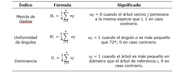 La estructura de los sitios se caracterizó mediante tres metodologías: mezcla de especies, distribución espacial y diferencia de tamaños. El fundamento para el cálculo de estos índices consistió en utilizar como unidad de muestreo al grupo estructural, correspondiente a un conjunto de cinco árboles, de los cuales uno sirve de referencia e incluye los cuatro árboles vecinos más cercanos con los que convive (Pommerening, 2002; Kint et al.,2003; Castellanos-Bolaños et al., 2008 y 2010).