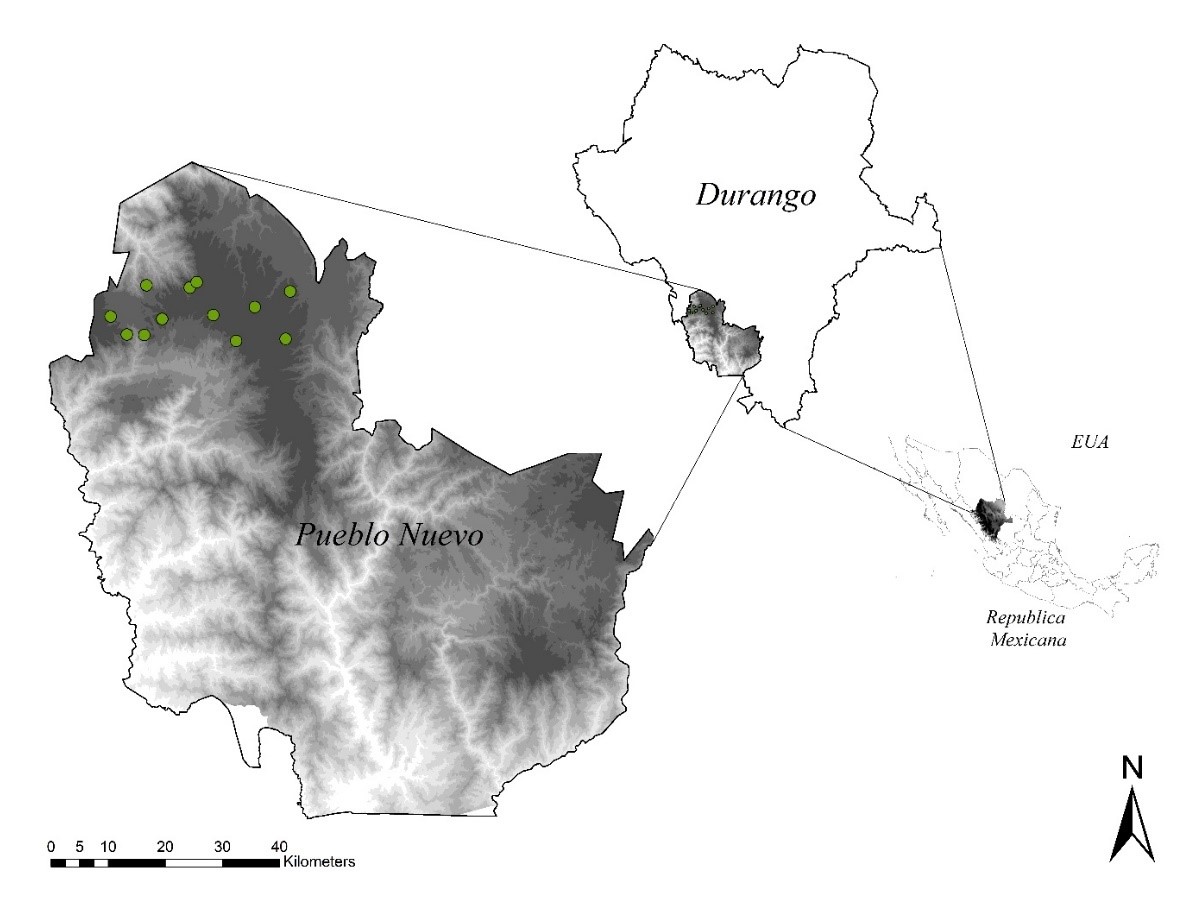 El estudio se llevó a cabo en el municipio Pueblo Nuevo, ubicado en la región de El Salto, la cual se encuentra en la parte suroeste del estado de Durango, México, y dentro de la Sierra Madre Occidental (Figura 1). Geográficamente, se localiza entre los paralelos 23°42’34.48” y 23°49’28.18” de latitud norte, y los meridianos 105°30’11.83” y 105°40’6.56” de longitud oeste. Tiene una altura sobre el nivel del mar de 2 500 a 2 900 m. Los tipos de suelo presentes son Litosol, Cambisol y Regosol con textura predominantemente de gruesa a media. El tipo de roca dominante es la ígnea extrusiva ácida (INEGI, 2015). En esta zona prevalecen climas de tipo (A)C(w2), C(w2), C(E)(M) y C(E)(w2), con precipitación media anual de 945.3 mm y temperatura promedio de 11.5 ºC (Inegi, 2017).