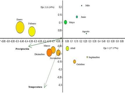 Subsequently, the influence of environmental variables on phenological variables was verified by means of a CCA analysis (Canonical Correlation Analysis) (McCune and Grace, 2002). The ratio between the precipitation and temperature averages and the averages of the phenophases of the indicator species was estimated by forest type for each monthly average during the years 2010 to 2017. Finally, the correlation of these months with the phenophases under study for the indicator species was verified. A Monte Carlo test with 1 000 permutations was utilized to determine the significance of the ordination. All analyses were performed with the R 3.6.3 statistical environment (R Core Team, 2021) and the Fitopac 2.1 software (Shepherd, 2010).