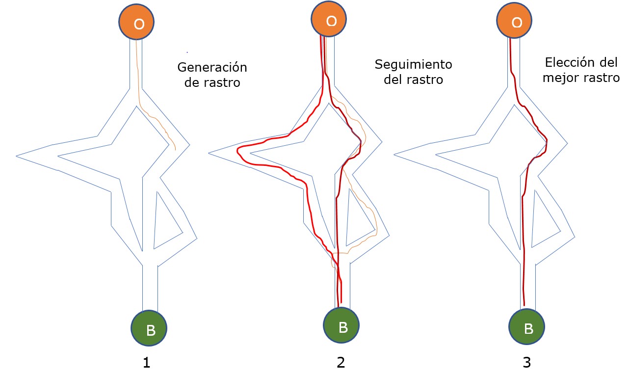 Un ACH es un algoritmo recurrente para solucionar problemas como el del viajante; consiste en simular el comportamiento de las hormigas para calcular la probabilidad de un camino mediante la creación de un rastro de feromonas e indicar la ruta a la que se debe de llegar (Goss et al., 1989; Dorigo et al., 1996). En este algoritmo, las hormigas son representadas por agentes computacionales simples (programa de computadora), los cuales toman un borde (camino); posteriormente se realiza la selección de feromonas (información relativa a los caminos previamente explorados). Cuando el agente termina la tarea, se evalúa el resultado para modificar el nivel de feromonas en el rastro y determinar la mejor ruta posible en la que se favorecen los bordes más cortos (también conocido como el trayecto más corto) con una mayor cantidad de feromonas, y el mejor agente es el que puede actualizar el rastro (Merkle y Middendorf, 2000). En la Figura 1 se presenta un ejemplo de colonia de hormigas, en la cual se ilustra el proceso de recorrido para determinar la mejor ruta en la búsqueda de un objetivo (O) y realizar el retorno a un punto base (B). En este caso se observa que después de la generación de los rastros, al final se elige el que representa la menor distancia por recorrer. Para el objetivo de la propuesta, el algoritmo permitirá al VANT encontrar la ruta de menor distancia en el proceso de verificación de incendios.