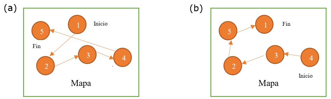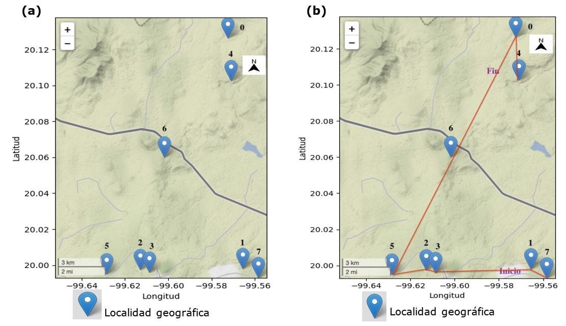 En la Figura 2 se presentan dos mapas; en la Figura 2a se observan las localidades geográficas extraídas de un municipio en donde ocurrieron incendios forestales, y en la Figura 2b se muestra el recorrido que debe de realizar un VANT para la verificación de un posible incendio de acuerdo con el resultado que obtuvo el ACH. El orden correspondiente del recorrido de la Figura 2b es [7, 1, 3, 2, 5, 6, 0, 4].
