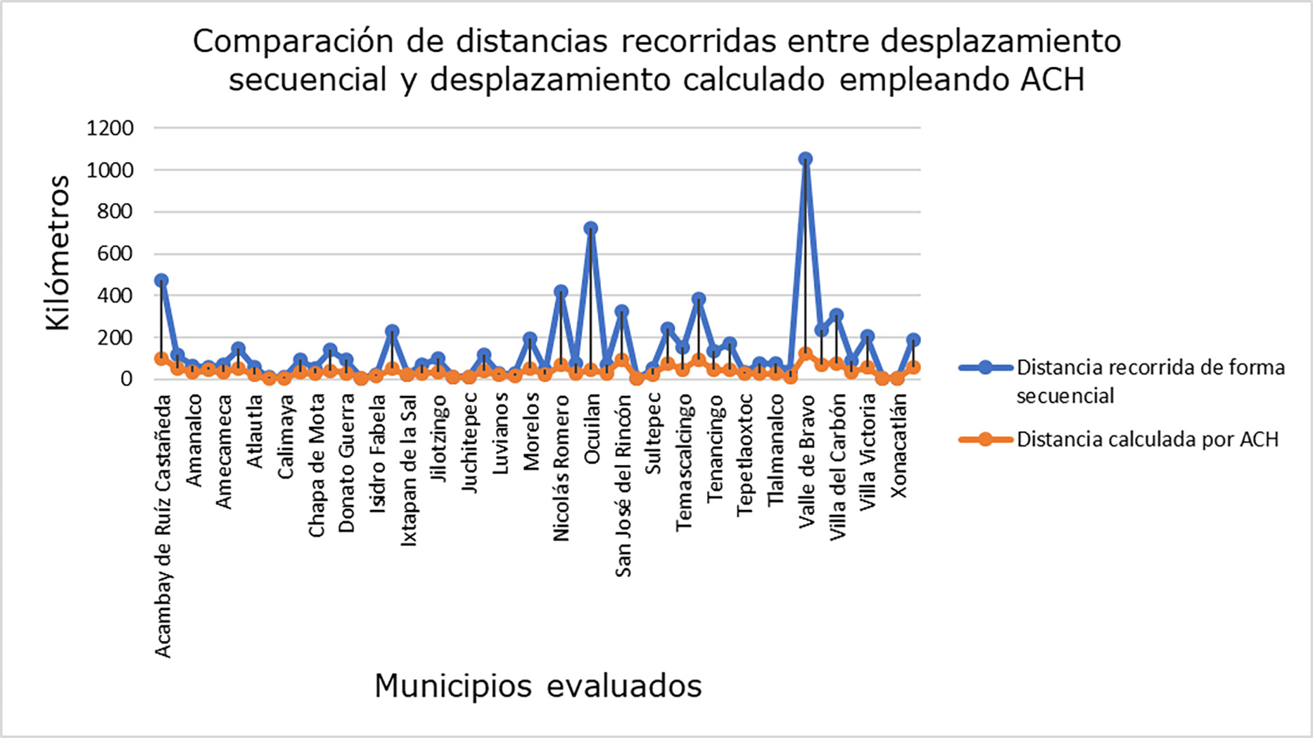 En la Figura 4 se presenta una gráfica de los resultados más relevantes, en la cual es posible comparar la reducción en el recorrido de la ruta por cada municipio. El más notable fue Valle de Bravo, que pasó de un recorrido total en el escenario A de 1 056.56 km a 125.01 km en el escenario B. Para el caso anterior, se observa claramente la ventaja que tiene el ACH sobre el cálculo de rutas que se generan sin un proceso de minimización de distancias. Por otra parte, es evidente que en sitios en los que existen tres localidades con distancias de pocos kilómetros, la reducción es inferior a 5 %. En municipios con tres localidades, pero con mayor distancia entre ellas, se pueden obtener mejores resultados en el proceso de minimización, como sucedió en Calimaya y Malinalco.