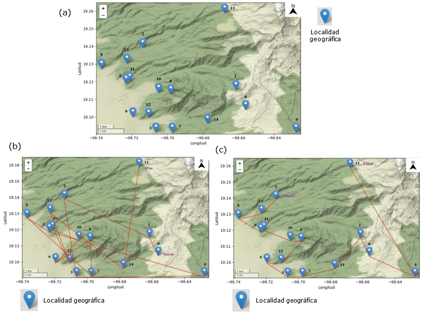 En la Figura 5a se muestran las localidades geográficas en las cuales se han presentado incendios forestales en el municipio Amecameca, estas se indican por marcadores en forma de globos azules que contienen un nombre de referencia (nombre del municipio e índice de la localidad) para obtener una referencia espacial de donde ocurrió el incendio. En la Figura 5b se muestra la ruta calculada de forma secuencial, y en la Figura 5c la ruta calculada con ACH.