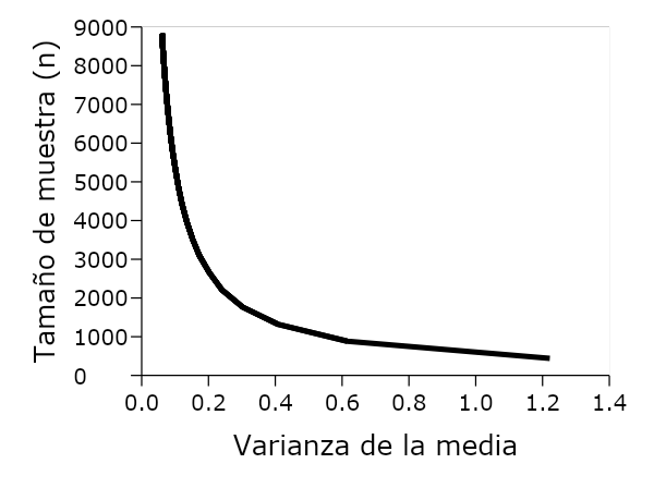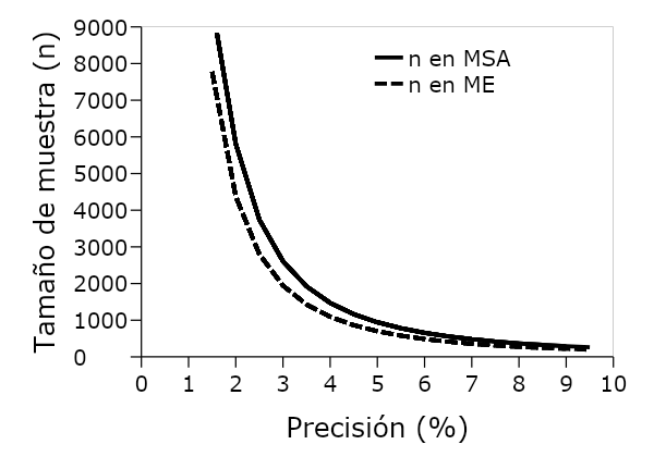 El análisis del comportamiento del tamaño de muestra () al variar la precisión evidenció que para lograr altas precisiones (menores a 2 %) se requiere un número más grande de sitios (Figura 2a), lo que implica un mayor esfuerzo de muestreo y que los costos se incrementen. Se detectó que el MSA es más exigente en tamaño de muestra que el ME, situación lógica porque el primero no se apoya en la información auxiliar de estratos en la población, en la que las unidades que los componen son internamente lo más homogéneas posibles y lo más heterogéneos entre ellos; esto permite que el error de muestreo se reduzca y que la precisión mejore (Pérez, 2005). Por lo anterior, para un mismo tamaño de muestra, el ME tiene mayor ganancia en precisión que el MSA.