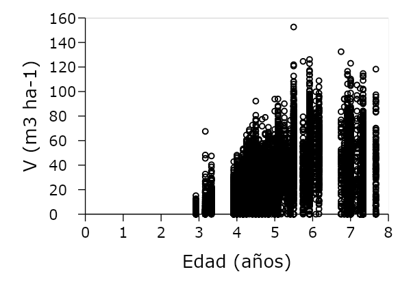 El valor de la razón V/AB en este estudio fue ligeramente menor al que se obtiene con un sistema de crecimiento desarrollado por Tamarit et al. (2019) para la misma especie y región de estudio, el cual fue de 5.3 m3 ha-1 para la condición promedio (índice de sitio 15 m). En tanto, el valor de razón V/edad fue menor al de 9.3 m3 ha-1 estimado con el sistema de crecimiento para la misma condición promedio referida.