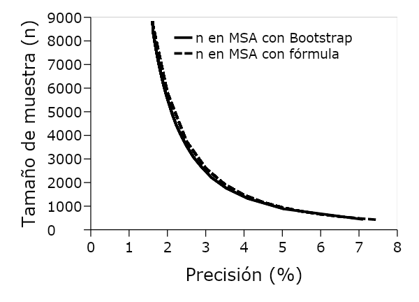 La tendencia de los promedios de las precisiones estimadas, al variar el tamaño de muestra, fue muy similar cuando se le determinó con la técnica de Bootstrap para el MSA que cuando se obtuvo con fórmula (Figura 2b); comportamiento que da pauta para asumir que en el resto de los estimadores evaluados se definirían patrones de correspondencia similares.