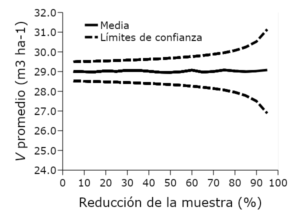 El tamaño de muestra óptimo para la media del volumen en MSA y ME se determinó al simular un muestreo repetido mediante la técnica de Bootstrap con el programa estadístico libre R versión 3.6.2 (https://www.r-project.org, R Development Core Team, 2020) para Windows. La muestra total (8 830 sitios = 100 %) se redujo gradualmente en intervalos de 5 %, en cada nivel de reducción se obtuvieron 30 muestras sin reemplazo (Marchi et al., 2017) a las que se les calculó la media, la varianza de la media, los y la precisión; posteriormente, se obtuvo el promedio de cada parámetro para analizar sus comportamientos gráficos. El tamaño de muestra óptimo se determinó con precisión de 2.5 % (α=0.05) y se comparó con el calculado por la ecuación 3. Para el ME, la distribución del tamaño de muestra en cada estrato se realizó de acuerdo con las formulaciones respectivas citadas por Cochran (1993) y Pérez (2005) para las asignaciones proporcional y Neyman.