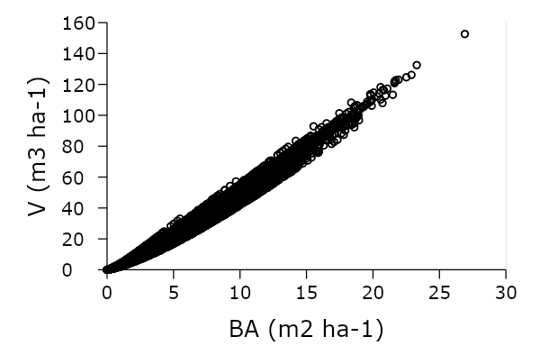 The V/AB ratio value in this study was slightly lower than that determined with a growth system developed by Tamarit et al. (2019) for the same species and study region, which was 5.3 m3 ha-1 for the average condition (site index 15 m). Meanwhile, the value of the V/age ratio was less than the 9.3 m3 ha-1 estimated with the growth system for the same average condition referred to.