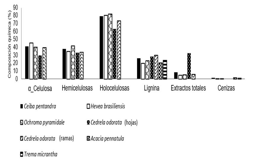 La composición química de los taxones estudiados evidencia comportamientos específicos en diferentes procesos; así las especies con alto contenido de alfa-celulosa y hemicelulosa como Ceiba pentandra, Hevea brasiliensis y Ochroma pyramidale son ideales para procesos de pulpeo y bioconversión de carbohidratos.