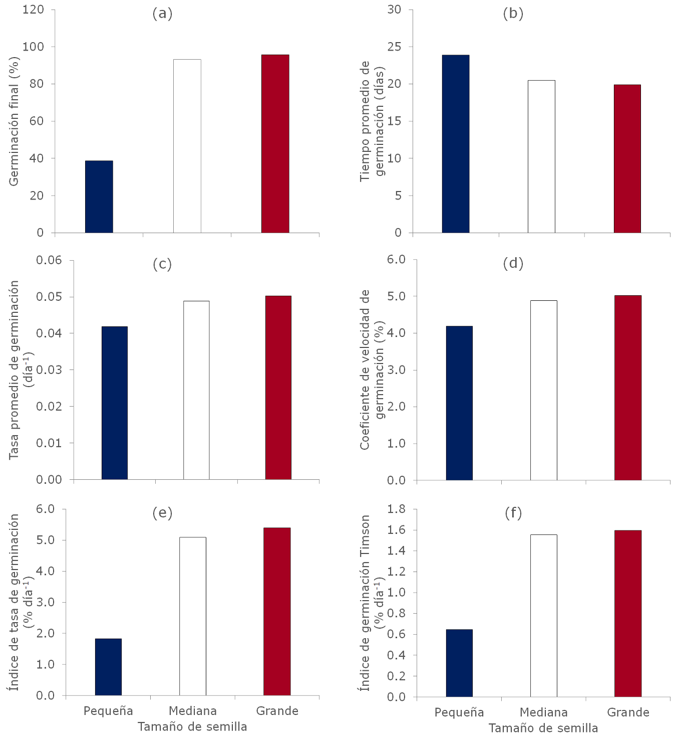 Las semillas grandes y medianas registraron mayores porcentajes de germinación final (GF) (96 y 93 %, respectivamente), pero no tuvieron diferencias significativas (ρ=0.9983) con las semillas de menor tamaño; también mostraron menor tiempo promedio de germinación (TPG) (media=20 días) y alto Índice de Tasa de Germinación (ITG) (5.4 y 5.1 % día-1, respectivamente) e Índice de Germinación Timson (IGT) (1.6 % día-1) comparado con las semillas pequeñas (GF=39 %, TPG=24 días, 1.8 % día-1 e IGT=0.6 % día-1) (figuras 1a, 1b, 1e y 1f). Asimismo, las semillas grandes y medianas tuvieron valores más altos de tasa media de germinación (TMG) (0.05 dia-1) y coeficiente de velocidad de germinación (CVG) (5.0 y 4.9 %) que las pequeñas (TMG=0.04 día-1 y CVG=4.2 %) (figuras 1c y 1d).