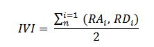 La estructura horizontal de la masa se determinó mediante la caracterización de la distribución de clases diamétricas presentes, asimismo se cuantificó el número de individuos por cada uno de los taxones. La abundancia se calculó con base en el número de árboles por especie y la dominancia en función del área basal. Dado que se realizó un censo, no fue necesario evaluar la frecuencia de las especies. Con los indicadores referidos se estimó el Índice de Valor de Importancia (IVI) (Ecuación 3), con el promedio porcentual de 0 a 100 de los indicadores ecológicos previos (Alanís-Rodríguez et al., 2011):