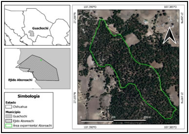 El estudio se realizó en el ejido forestal Aboreachi, ubicado en el municipio de Guachochi, al suroeste del estado de Chihuahua, México; en la provincia fisiográfica de la Sierra Madre Occidental, las coordenadas del sitio son 27°11'46" N 107°23'13" O (Figura 1). El área corresponde a un bosque templado frío incoetáneo con diversas especies forestales; los suelos son de tipo Cambisol éutrico, Planosol éutrico y Regosol éutrico, de textura media a fina (INEGI, 2014). El clima es C(E)(w2)(x') que corresponde a uno semifrío húmedo, con temperatura media anual entre 5 y 12 °C, con precipitación media anual de 621.3 mm (INEGI, 2008).