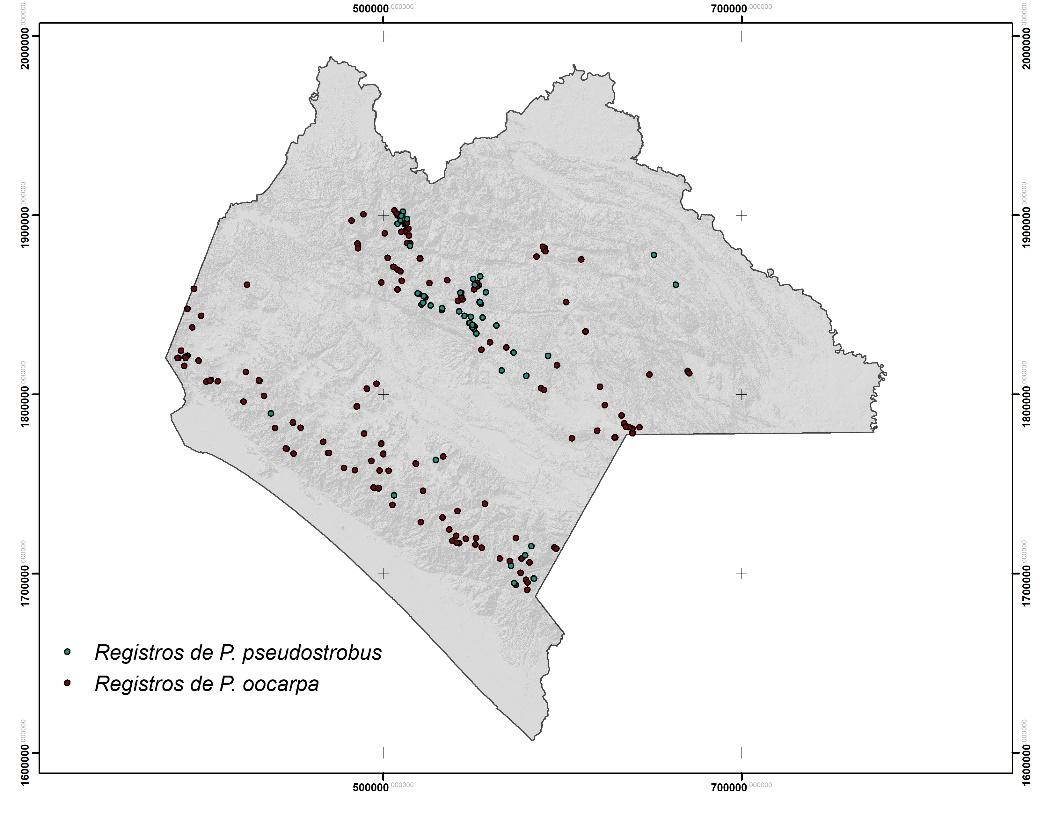 Figure 1. Presence of Pinus oocarpa Schiede ex Schltdl. and Pinus pseudostrobus Lindl.