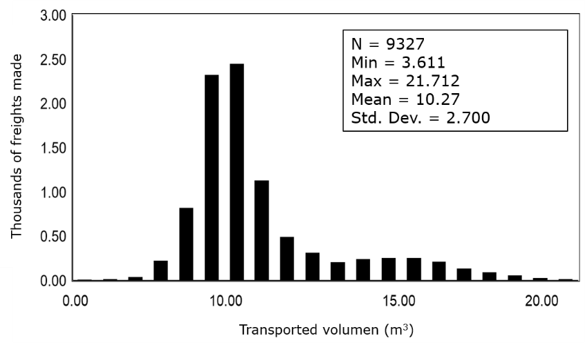 To carry out the analysis and subsequent evaluation of the information regarding the supply of raw materials, 9 327 shipments of round wood were considered, in which the comparison factor was the annuity and as a variable the volume transported by truck with an 8-ton capacity, with intervals from 3.61 to 21.71 m3r, cost of the raw material and number of freights carried out in each year of activity. The intervals of supply volumes between annuities were evaluated using quartiles (Q1, Q2 and Q3), which made it possible to identify outliers or data entry errors, in which the first quartile (Q1) represents 25 %, the second quartile (Q2 or median) 50 % and the third quartile (Q3) 75 % of the observations, sorted and divided into four equal parts.