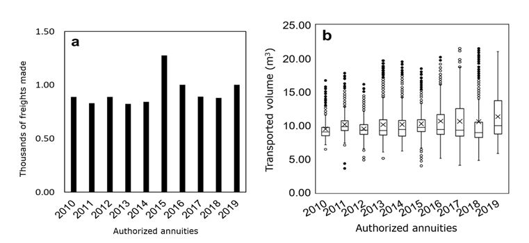 Regarding the freights involved in the transport of sawn wood, there are significant differences (p=0.001) in the average volume transported. Pearson's correlation analysis indicates a positive relationship between the increase in authorized timber volume and the increase in the number of sawn timber shipments made, with a value of r=0.495.