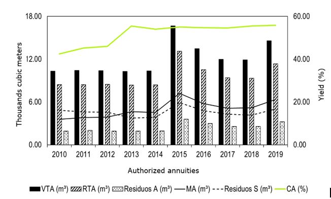 VTA = Total Tree Volume; RTA: Total Tree Roll; Residuos A = Hatvesting wastes; MA = Sawn Wood; Residuos S= Solid Waste; CA = Sawing Coefficient.