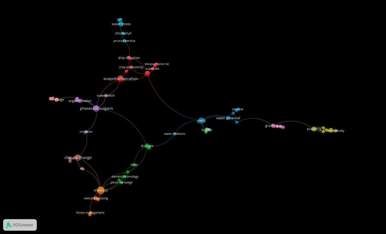 Figure 8. Co-occurrence network for the search of articles by INIFAP researchers on the sustainability of natural resources included in the SciELO Citation Index (2002-2020).