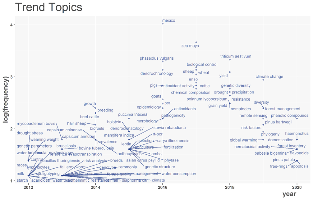 Figure 5. Trend topics in the key words in the delimited Scopus search for researchers attached to INIFAP (2000-2020).
