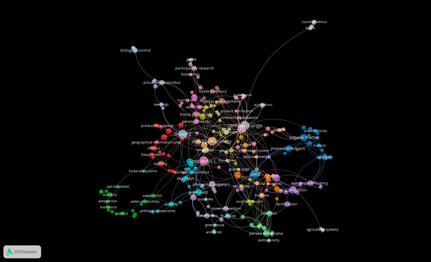 Figure 4. Keyword co-occurrence network in the delimited Scopus search for researchers affliated to INIF, INIA, INIP, and INIFAP (2000-2020).