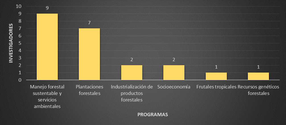 Figure 13. INIFAP researchers that published on the Sustainability of Natural Resources in the Mexican Journal of Forest Sciences (Revista Mexicana de Ciencias Forestales), by research program (1985–2009).