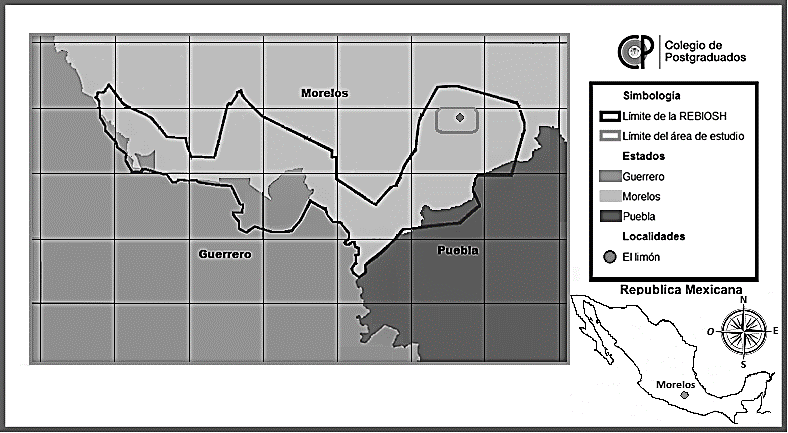 El estudio se llevó acabo en el ejido El Limón de Cuauchichinola, municipio Tepalcingo de Hidalgo, que se ubica en el sureste del estado de Morelos, México, en las coordenadas 18°32' N y 98°56' O, a una altitud de 1 220 m. Cuenta con 4 236 ha de extensión, de las cuales 1 970 ha son arboladas; forma parte de la Reserva de la Biosfera Sierra de Huautla (Figura 1).
