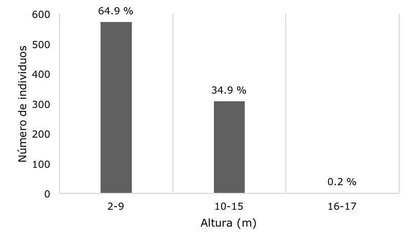 La altura promedio en el total de los sitios muestreados fue de 8.4 ± 1.9 m, con un intervalo de 4.1 a 11.2 m (Cuadro 1); las especies con mayor altura fueron Conzattia multiflora y Lysiloma acapulcensis (Kunth) Benth. (16 m), se diferenciaron dos estratos: el inferior estuvo constituido por categorías de 2 a 9 m (64.9 % de los individuos), y el superior comprendió categorías de 10 a 15 m (34.9 %); mientras que solo 0.2 % rebasaron 15 m (Figura 2).