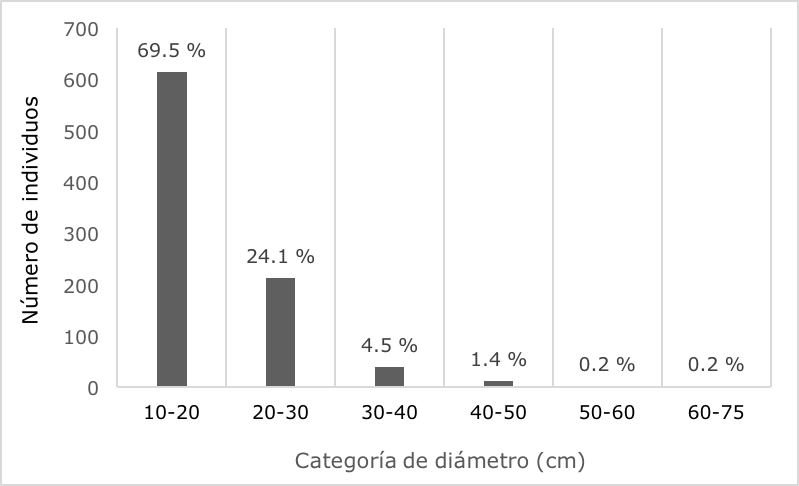 El promedio del DAP fue de 18.4 ± 2.6 cm, en un intervalo de 10 a 74.3 cm (Cuadro 1). Las especies con los valores promedio más sobresalientes fueron Ficus cotinifolia Kunth (47.4 cm), Euphorbia fulva Stapf (37.2 cm) y Bursera schlechtendalii Engl. (29.3 cm). De 883 individuos, 93.6 % pertenecen a las dos categorías diamétricas menores (Figura 3).