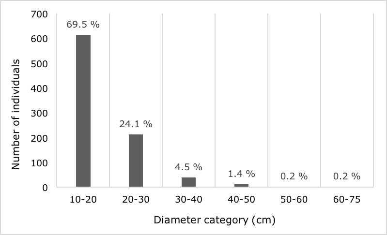 The mean DBH was 18.4 ± 2.6 cm, and the interval ranged between 10 and 74.3 cm (Table 1). The species with the most outstanding average values were Ficus cotinifolia Kunth (47.4 cm), Euphorbia fulva Stapf (37.2 cm) and Bursera schlechtendalii Engl. (29.3 cm). From 883 individuals, 93.6 % belong to the two smaller diameter categories (Figure 3).
