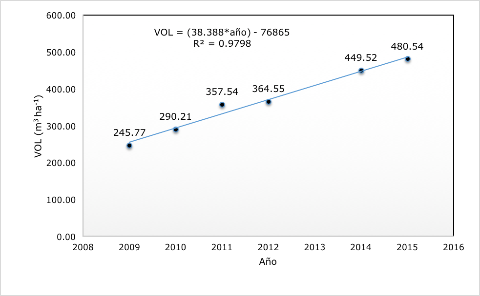 La Figura 1 muestra los valores de volumen real y modelado por año durante el período 2009-2015. No se cuenta con registros epidométricos de la plantación anteriores a 2009. La tendencia de la acumulación de volumen de madera de fustes resultó lineal, y alcanzó un incremento de 38.39 m3 ha-1 año-1 (Figura 1), valor similar al consignado por Sáenz et al. (2011) para plantaciones de pino en Michoacán y superior, incluso, al indicado por Webb (1980, citado por Muñoz et al., 2010).