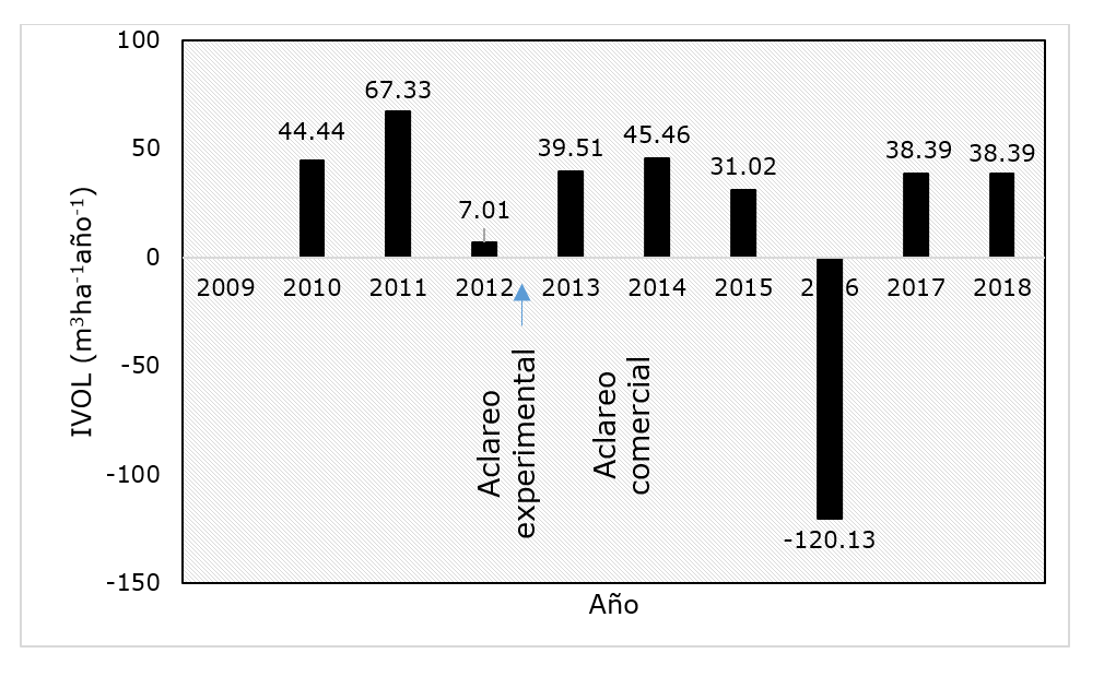 En la Figura 2 se muestran los incrementos de volumen desde 2009 hasta la conclusión programada del proyecto (2018). En la figura, se observa que los incrementos anuales de volumen aumentaron hasta 2011. Al año siguiente se practicó un aclareo experimental en la plantación, por lo que los incrementos disminuyeron. No obstante, un año después (2013), el incremento de volumen alcanzó un nivel parecido al de 2010 y continuó en aumento; sin embargo, en 2015 se prsentó una disminución, que se atribuye a la alta densidad del arbolado, mismo que indica que la plantación requirió de una intervención ese año. Esta aseveración coincide con el hallazgo de Vásquez (2014), quien determinó que la productividad primaria neta (PPN) de esa plantación comenzó a declinar y recomendó la implementación de un aclareo.