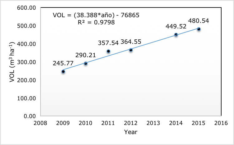 Figure 1 shows the values of real volume and modeling per year during the 2009-2015 period. There are no epidometric records of the plantation before 2009. The trend of the accumulation of timber volume of stems was linear, which reached an increase of 38.39 m3 ha-1 year-1 (Figure 1), a similar value to that recorded by Sáenz et al. (2011) for pine plantations in Michoacán and even higher to that mentioned by Webb (1980, quoted by Muñoz et al., 2010).