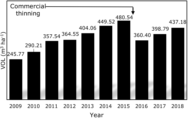 Figure 4 shows the volumes recorded annually for the period between 2009 and 2015, as well as the volumes predicted for the period after commercial thinning.