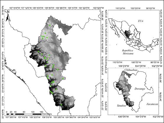 The study area was located in the mountain system called Western Sierra Madre in the state of Durango, between the geographic coordinates 26°26'25.7" N, and 106°03'57.5" W, and 23°10'29.5" N and 105°22'09.2" W (Figure 1).