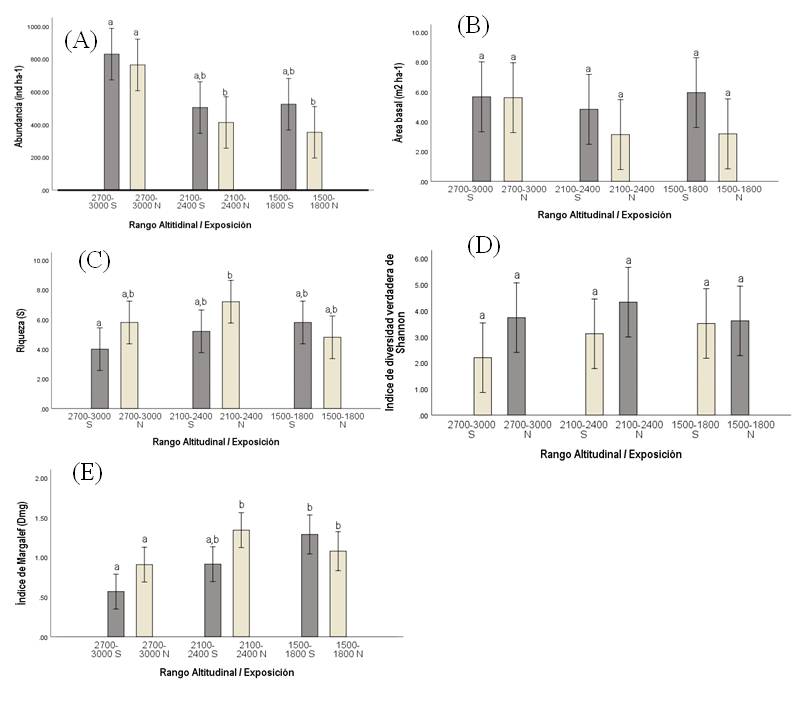 Diversity indexes. Shannon's true diversity showed no differences (p<0.05) between areas, with an average of 2.94 ± 1.58 on the southern exposure and 3.89 on the northern exposure (Figure 2D). Regarding the Margalef index, differences (p<0.05) were observed in the areas located at a higher altitude with respect to lower areas. The average values were 0.73 for both exposures in interval 1, and 0.98, in interval 3 (Figure 2E).