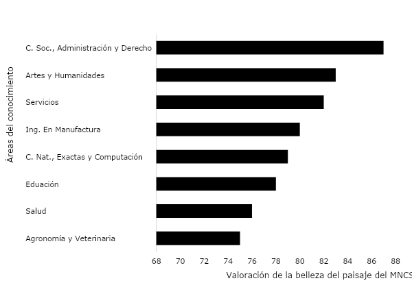 Áreas del conocimiento = Areas of knowledge; C. Soc., Administración y Derecho = Social sciences, Administration and Law; Artes y Humanidades = Arts and Humanities; Servicios = Services; Ing. en manufactura = Manufacturing engineering; C. Nat., Exactas y Computación = Natural, Exact and Computing Sciences; Educación = Education; Salud = Health; Agronomía y Veterinaria = Agronomy and Veterinary; Valoración de la belleza del paisaje del MNCS = Appreciation of the MNCS landscape.