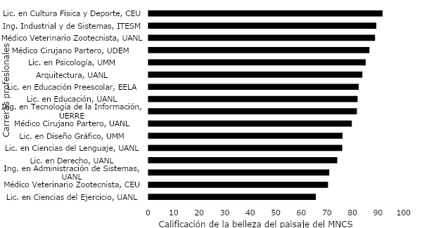Carreras profesionales =Professional careers; Licenciatura en Cultura Física y Deporte, CEU = Physical Culture and Sport, CEU; Ing. Industrial y de Sistemas, ITESM = Industrial and Systems Engineer, ITESM; Médico Veterinario Zootecnista, UANL = Veterinary Zootechnician, UANL; Médico Cirujano Partero, UDEM = Midwife, surgeon Medic, UDEM; Licenciado en Psicología, UMM = Psychologist, UMM; Arquitectura, UANL = Architecture, UANL; Licenciado en educación preescolar, EELA = Preschool educator, EELA; Licenciado en Educación, UANL = Educator, UANL; Ing. en Tecnología de la Información = Information Technology Engineer; Médico Cirujano Partero,UANL = Midwife, surgeon Medic, UANL; Licenciado en Diseño Gráfico, UMM = Graphic designer, UMM; Licenciado en Ciencias del Lenguaje, UANL = Language Science, UANL; Licenciado en derecho, UANL = Lawyer, UANL; Ing. en Administración de Sistemas, UANL = Systems Administrator Engineer, UANL; Médico Veterinario Zootecnista, CEU= Veterinary Zootechnician, CEU; Lic. en Ciencias del Ejercicio, UANL = Bachelor's Degree in Exercise Science; Calificación de la belleza del paisaje del MNCS = Rating of the aesthetic appreciation of the MNCS landscape.