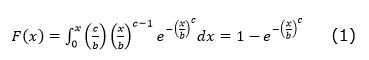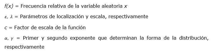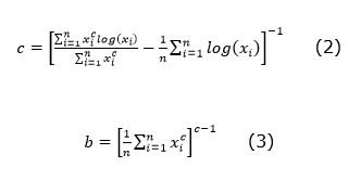 El método comúnmente usado para estimar los parámetros de la FDP Weibull con buenas estimaciones es ML, en comparación con otros procedimientos (Sghaier et al., 2016). De acuerdo a Nanos y Montero (2002), los parámetros b y c se resuelven con las expresiones siguientes:
