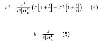El MM consiste en relacionar los parámetros b y c de la FDP Weibull con el primer y el segundo momento de la distribución diamétrica (diámetro promedio y varianza). Lei (2008) indica que los parámetros b y c se resuelven con las expresiones siguientes: