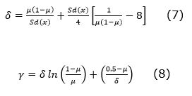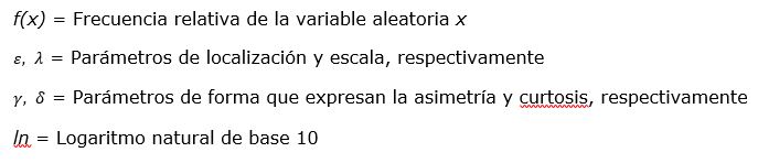 Los parámetros de la FDP SB Johnson se determinaron por el método de momentos (MM) (Soares et al., 2003); se consideró el valor del parámetro de localización () como el diámetro mínimo de la distribución y el valor del parámetro de escala () como la diferencia entre al valor máximo y mínimo de la distribución (intervalo); en tanto que los parámetros de forma () se estimaron con las expresiones siguientes: