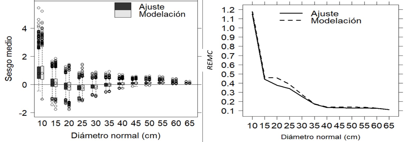 El análisis de la capacidad de ajuste de las FDP se basó en comparaciones numéricas y gráficas de los errores (residuos). Los estadísticos utilizados para evaluar la bondad de ajuste fueron: (i) Sesgo medio (SM), cuyo valor óptimo es cero, lo que implica que las desviaciones entre los valores reales y predichos se compensan para el total de los datos analizados; y (ii) Raíz del Error Medio Cuadrático (REMC), el cual es un indicador de la precisión: cuanto menor sea su valor, menor será la diferencia entre los valores reales y los predichos (Gorgoso-Varela et al., 2020). Las expresiones matemáticas son las siguientes: