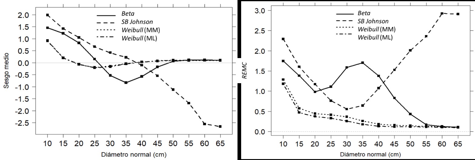 A la vista de la Figura 1, se observa que la FDP SB Johnson presentó los valores de SM y REMC más altos en las clases diamétricas menores, indicativo de que subestima las frecuencias en las clases diamétricas más pequeñas y sobreestima en las clases diamétricas a partir de 45 cm. La FDP Beta también subestima las frecuencias más pequeñas y sobreestima las frecuencias intermedias (30–40 cm), mejora su precisión a partir de la clase diamétrica de 45 cm. Finalmente, la estimación de las frecuencias con mejor precisión en todo el intervalo de las clases diamétricas observadas con una tendencia muy similar, se logró con el ajuste de la FDP Weibull mediante el MM y ML.