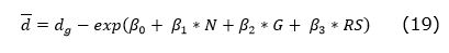 Dado que el dg siempre es igual o mayor que el , se utilizó un modelo matemático para reducir el sesgo que genera utilizar el dg originalmente estimado [], donde X es una matriz de las variables de rodal que caracterizan el estado del mismo a cualquier edad y que pueden obtenerse de un modelo de rodal estático o dinámico; es el vector de parámetros por estimar. Una vez conocido el valor de y del rodal, la varianza () (momento de segundo orden de la distribución respecto a la media) se calcula mediante la relación matemática: (Frazier, 1981).