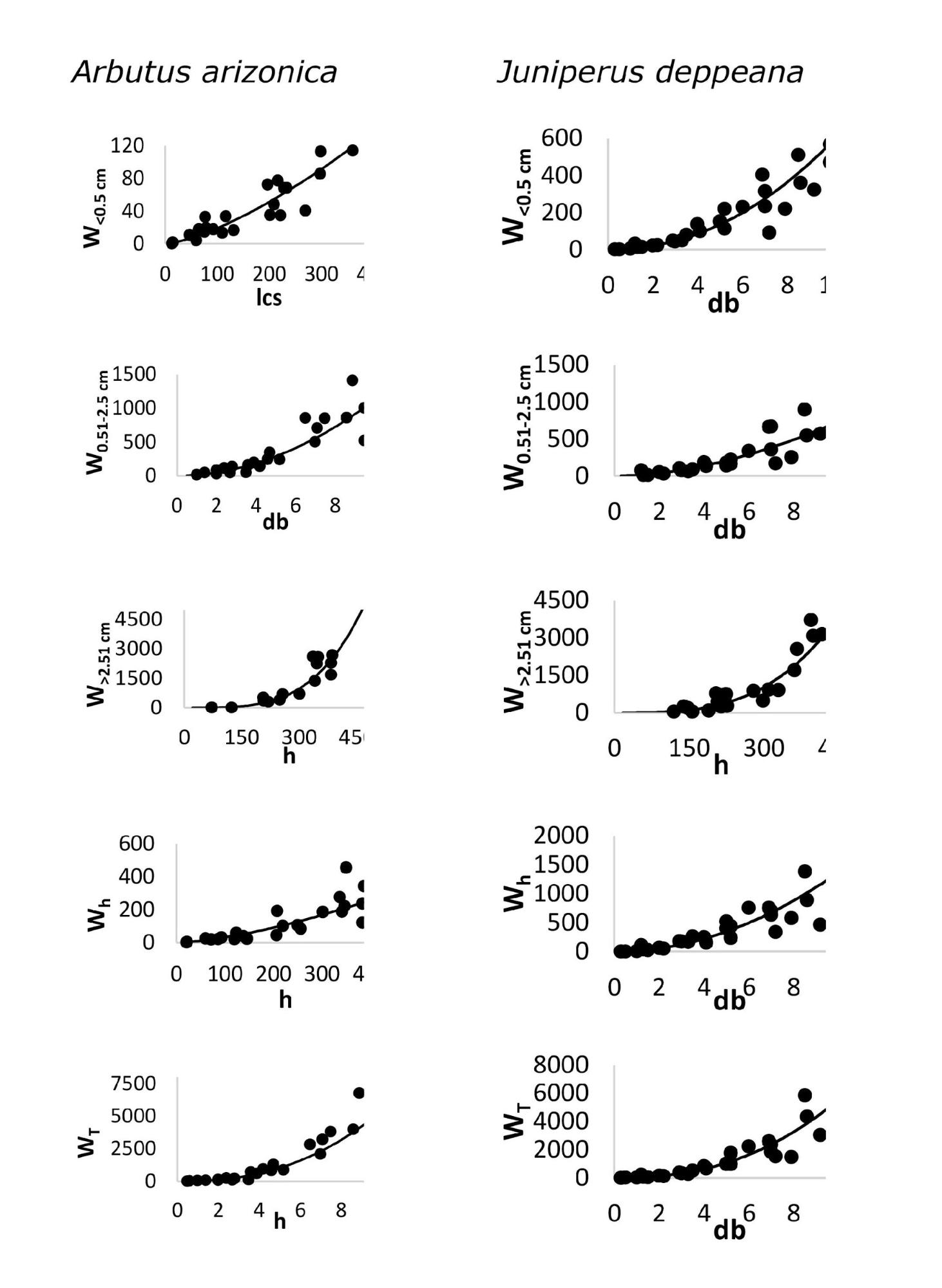 La representación gráfica de los valores de biomasa de fracciones por componente contra la variable independiente que mayor influencia tuvo en las ecuaciones alométricas se muestra en la Figura 1 para Arbutus arizonica, Juniperus deppeana, Quercus sideroxyla y Pinus cooperi.