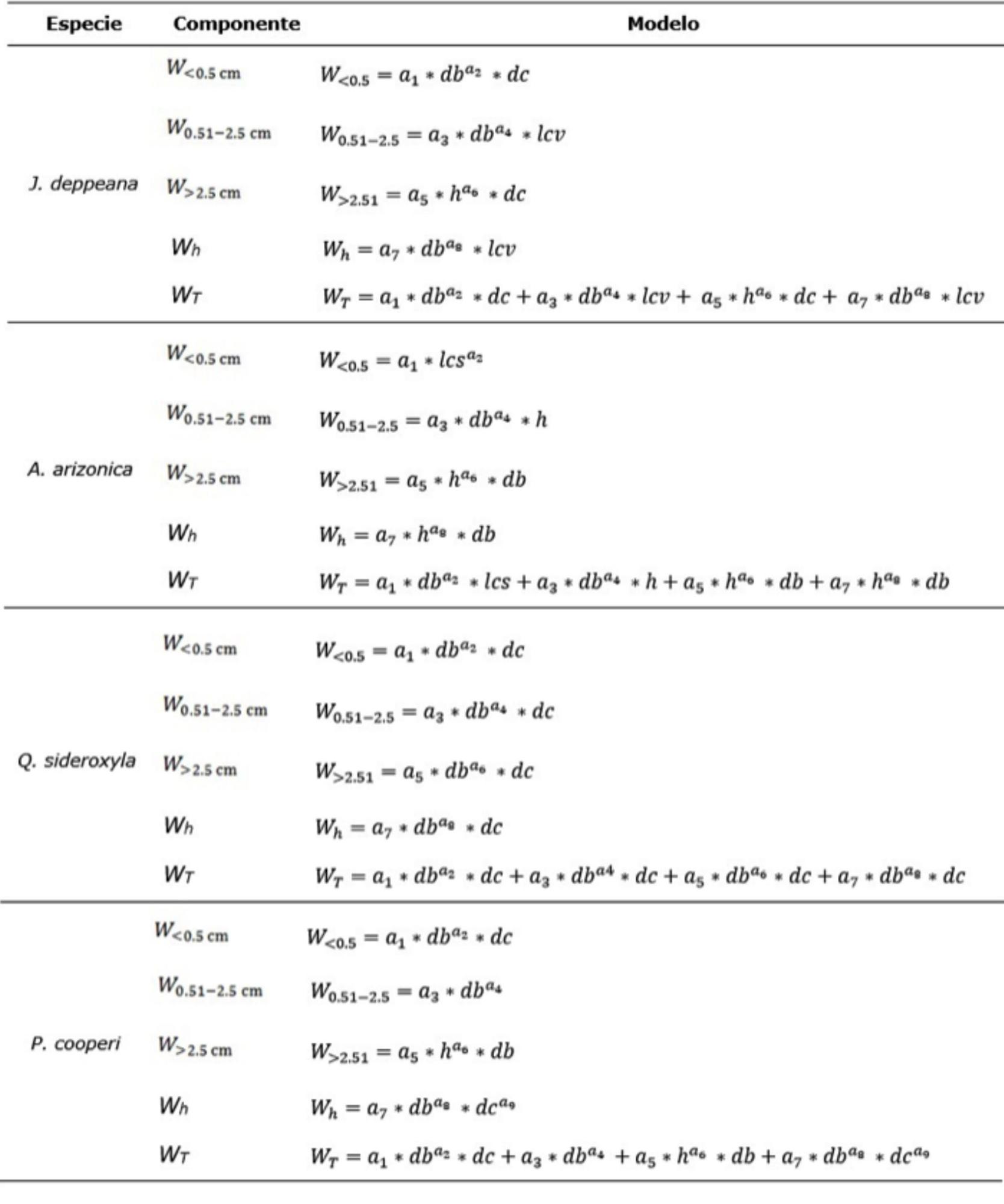 Cuadro 1. Modelos seleccionados para la estimación de la biomasa por fracción y total para la regeneración de Juniperus deppeana Steud., Arbutus arizonica Sarg., Quercus sideroxyla Humb. & Bonpl. y Pinus cooperi C.E. Blanco.