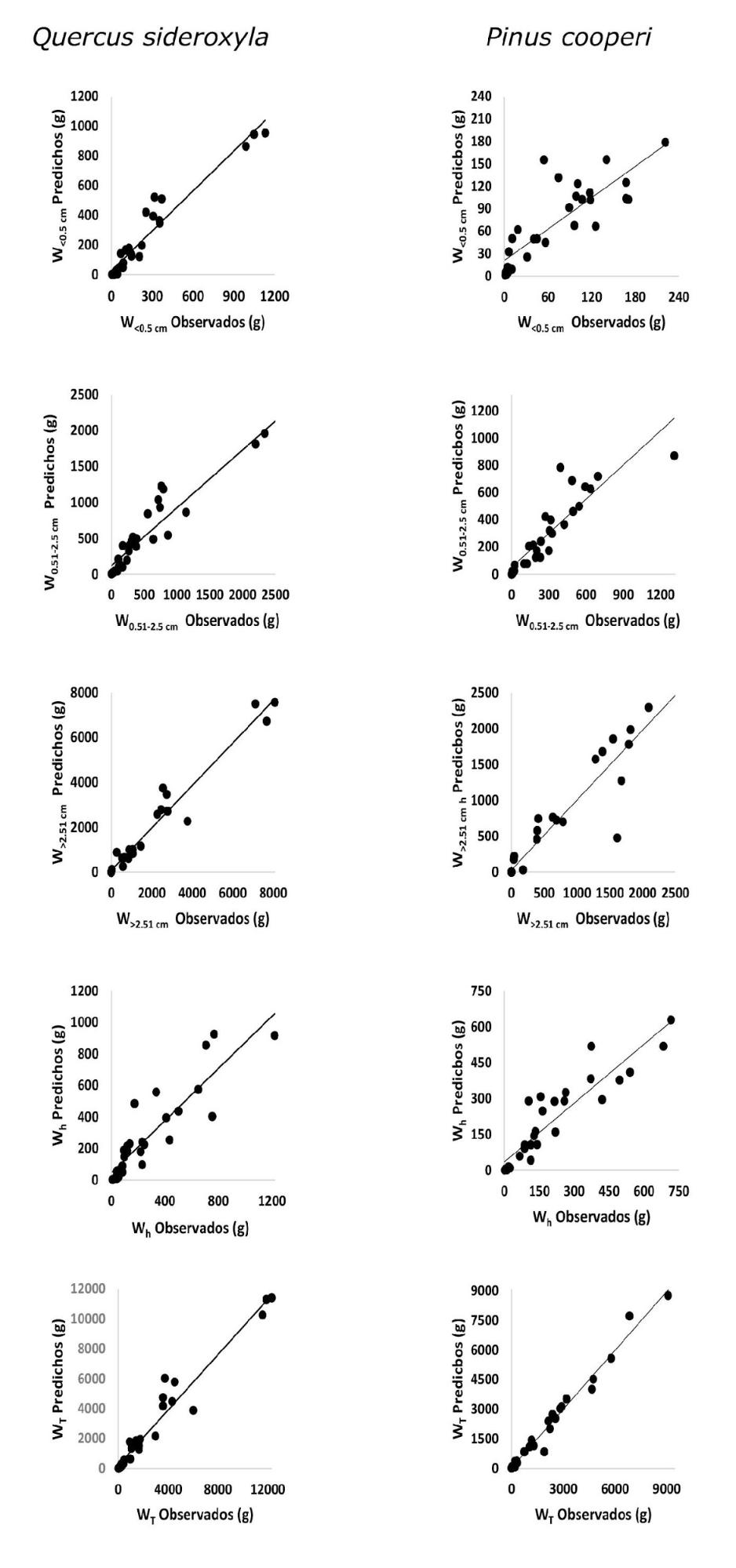 En la Figura 2 se presentan los valores observados frente a los predichos para las distintas fracciones de grosor, para las hojas y el peso total. La distribución de la nube de puntos sobre la diagonal indica que los modelos proporcionan estimaciones con bajo sesgo.