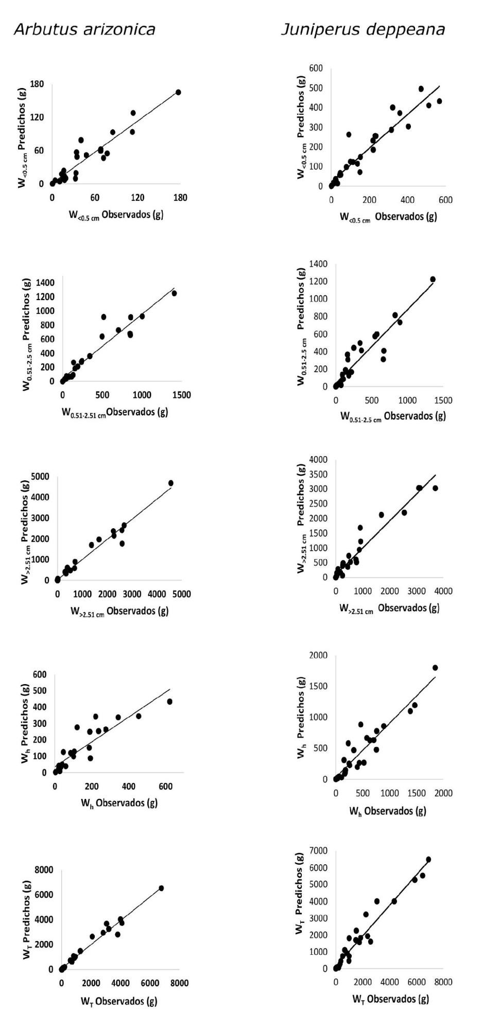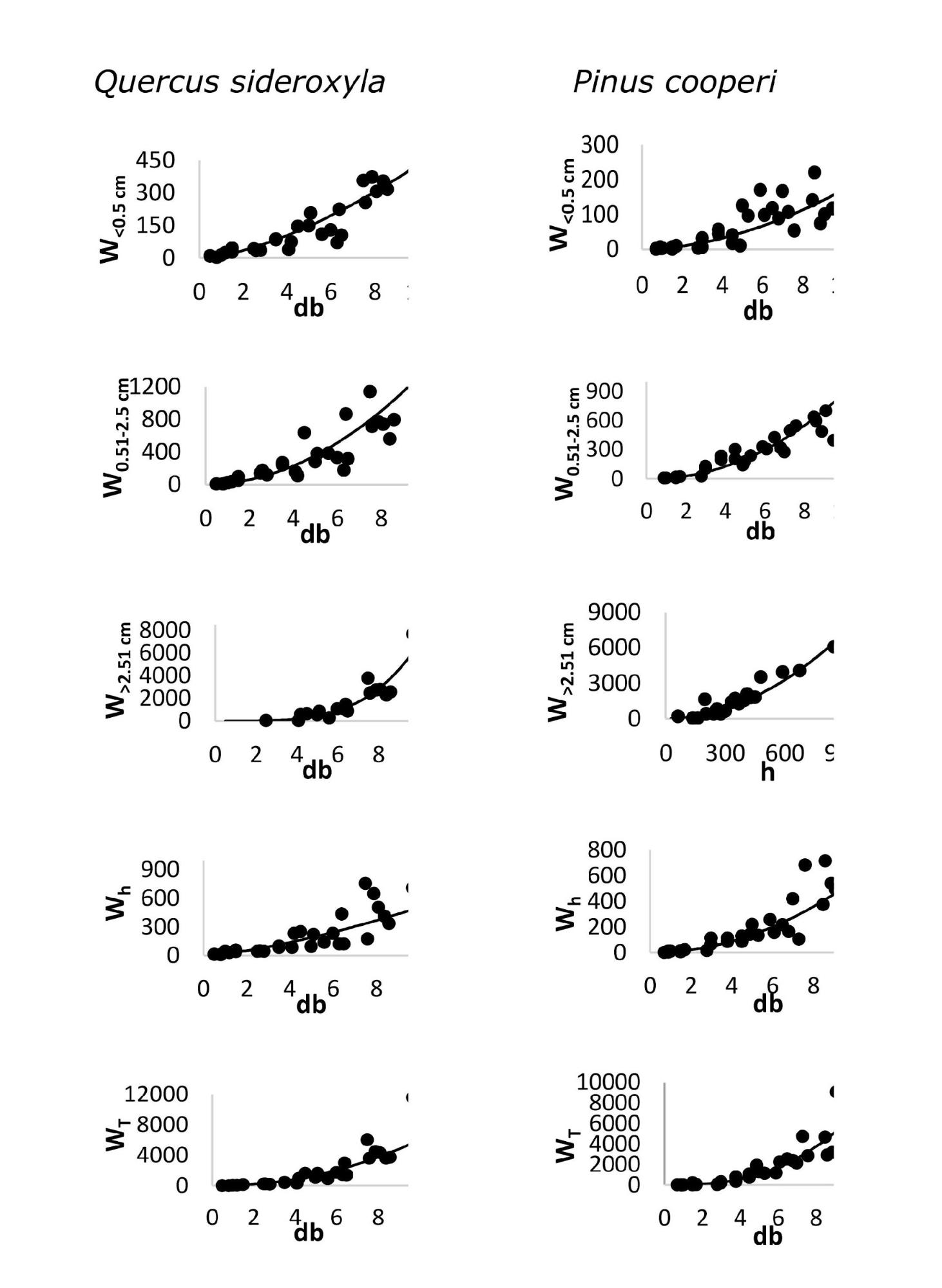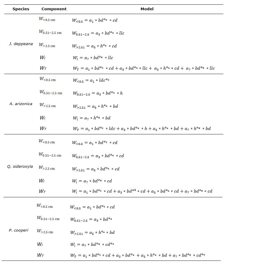 Table 1. Selected models for the estimation of the biomass by thickness fraction and total thickness of Juniperus deppeana Steud., Arbutus arizonica Sarg., Quercus sideroxyla Humb. & Bonpl. and Pinus cooperi C.E. Blanco at the regeneration stage.