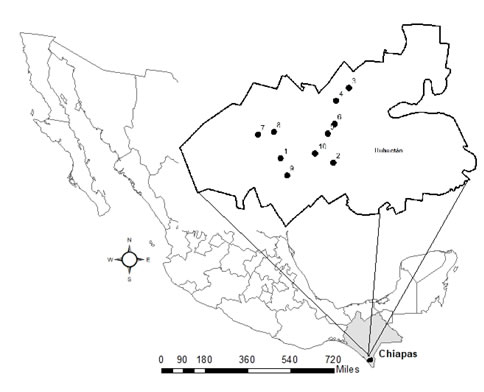 Se establecieron 10 unidades de muestreo (UM) al azar, arriba de la parte intermedia del municipio Huehuetán (de 80 a 540 msnm), donde predomina el cultivo del café (Figura 1). Cada sitio experimental o unidad de muestreo se denominó de acuerdo al nombre del ejido o el cantón (Cuadro 1). Dentro de cada uno, se separó un área de 1 000 m2 (20 x 50 m), con base en lo recomendado por Cox (1981) y Somarriba (1999) para comunidades de árboles en sistemas agroforestales.