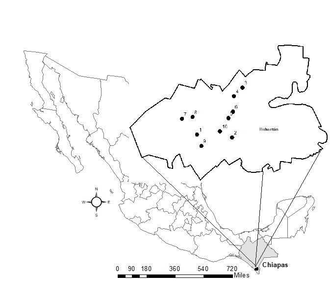 Table 1. Sampling locations of the vegetation associated with the cultivation of Coffea arabica L. in Soconusco, Chiapas.