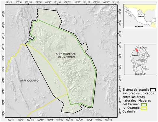 La investigación se llevó a cabo en el área ubicada entre las áreas naturales protegidas Maderas del Carmen y Ocampo, ambas incluidas en la categoría de Área de Protección de Flora y Fauna (APFF) (Conanp, 2016); el área de estudio abarca parte de los municipios Acuña, Múzquiz y Ocampo al noroeste del estado de Coahuila (Figura 1).