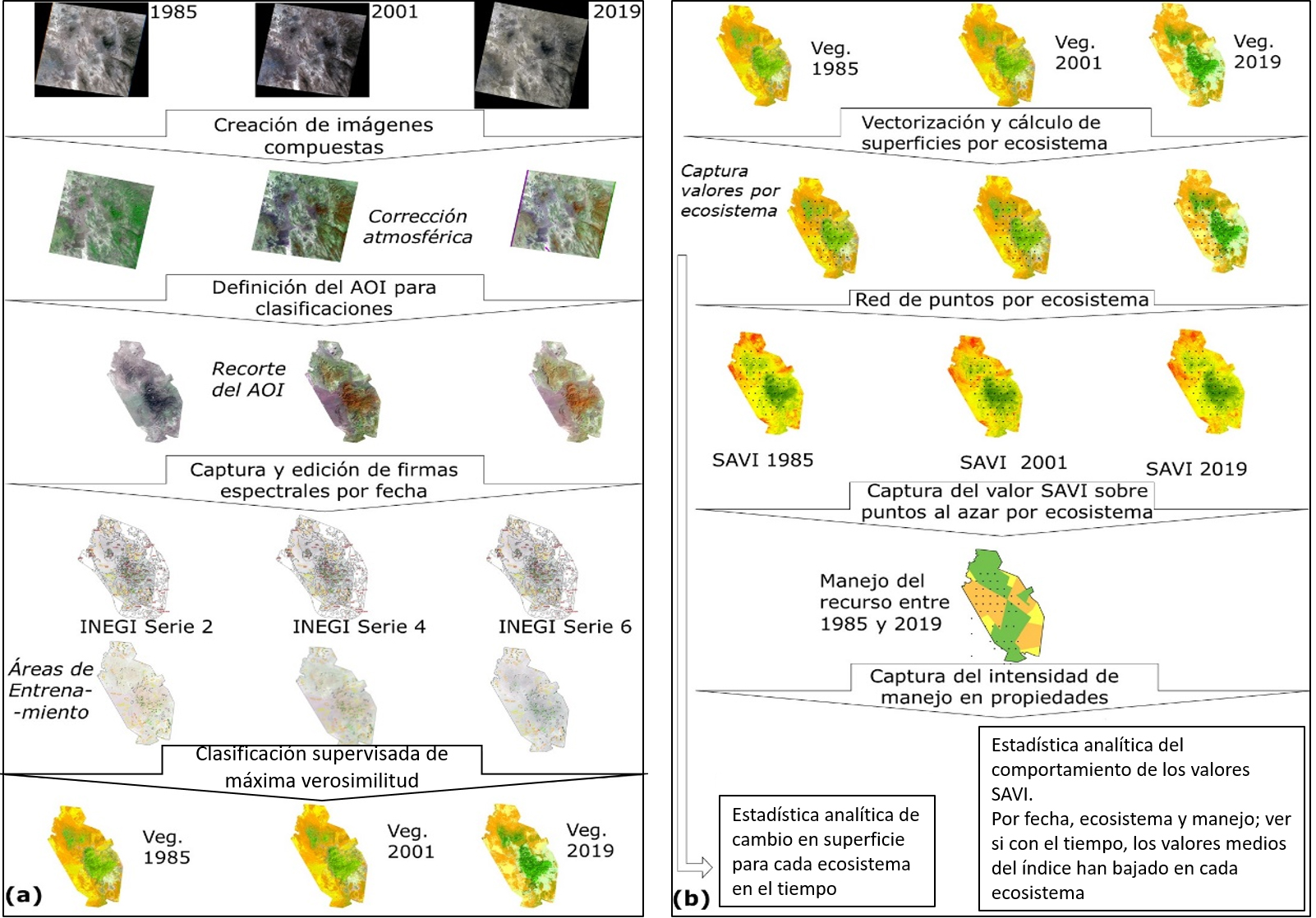Dentro del área de distribución de los tres ecosistemas clasificados se realizó un archivo shapefile de tipo puntual en patrón cuadricular, sistemáticamente separados cada 500 m con el módulo Repeating Shapes para ESRI (Jenness, 2012). Con el shapefile creado se capturaron los valores del índice SAVI correspondientes a las tres fechas analizadas, además de conservar el registro del ecosistema y el régimen de manejo, para ello se utilizó el módulo Extract Multivalues to Point de ArcGIS 10.8 (ESRI, 2020). De esta forma, se generó una base de datos de 22 250 registros con la coordenada UTM de cada registro puntual en el área de estudio. El arreglo de la base se organizó con valores de índice SAVI en tres fechas como variable principal, y los factores ecosistema (áreas de bosque, matorral y pastizales) y un factor de manejo (áreas de conservación, zonas privadas con manejo tradicional y zonas de uso ejidal con aprovechamientos extensivos). El esquema metodológico se describe en las figuras 2a y 2b.